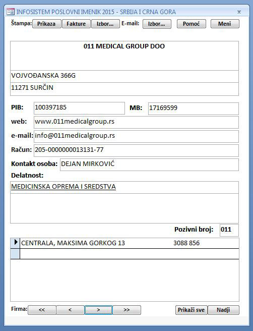 Svaka firma je predstavljena sa svim bitnim poslovnim podacima - adresa, telefoni, fax, pib, web (ukoliko ima), e-mail, delatnost, striktna poddelatnost.